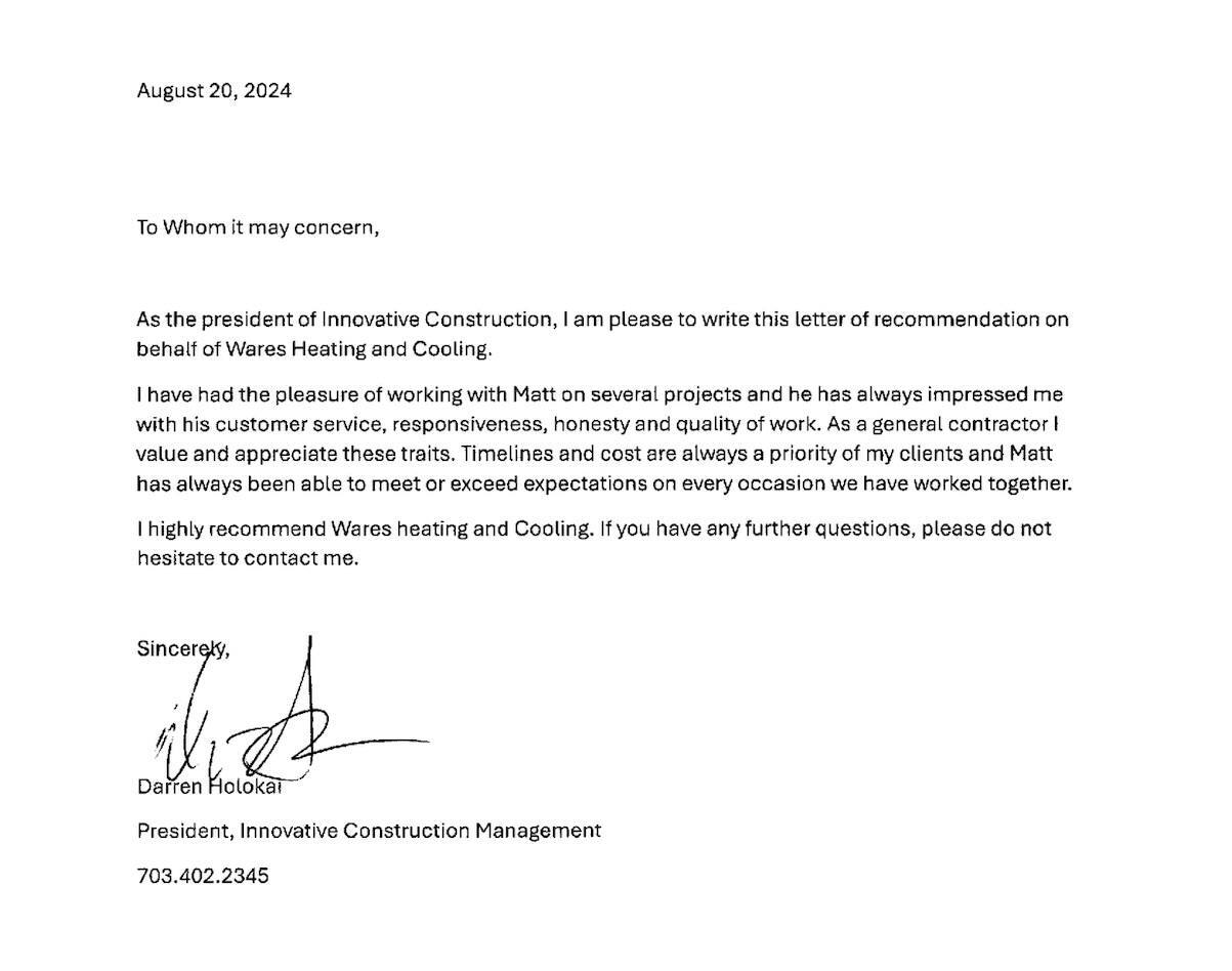 Posted on Paul WolfenbargerSeptember 16, 2024Trustindex verifies that the original source of the review is Google. Tech was very nice, and knowledgeable. Service fee was reasonable.Posted on Nancy RobinsonSeptember 5, 2024Trustindex verifies that the original source of the review is Google. Matt was simply amazing. When he got here in record time I might add, once I told him what my unit was doing he knew immediately what the problem was. And of course he fixed in record time. I recommend this company highly. Thanks Matt!Posted on Paul McElwainAugust 31, 2024Trustindex verifies that the original source of the review is Google. Very good experience!. Matt and Wendy are easy to contact and easy to deal with. All the members of the crew are polite and professional. I cannot recommend them too highly. Call Ware's and no one else.Posted on Daryl FranklinAugust 28, 2024Trustindex verifies that the original source of the review is Google. I couldn't have asked for better service. Thank youPosted on Laura JusticeAugust 27, 2024Trustindex verifies that the original source of the review is Google. Guaranteed Top of the line trusted business!!! I HIGHLY RECOMMEND THIS AC COMPANY! 💯Posted on Stevie KingAugust 24, 2024Trustindex verifies that the original source of the review is Google. Responsive, same day service. Efficient and quality work.Posted on Peggy AngelAugust 3, 2024Trustindex verifies that the original source of the review is Google. Excellent response time and fixed immediately upon arrival. Highly recommendPosted on Kevin SharpeJuly 24, 2024Trustindex verifies that the original source of the review is Google. Has always gotten to me the same day I called. Great people.